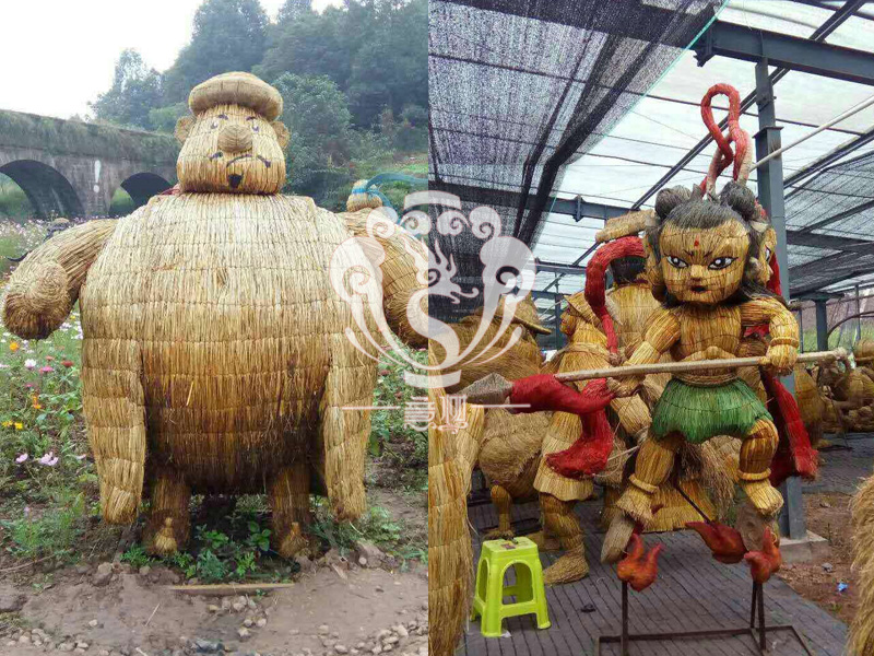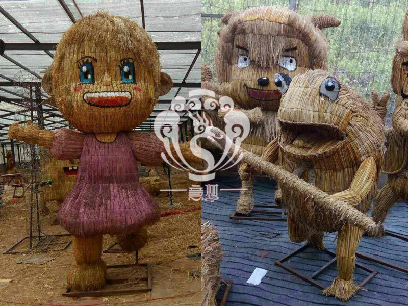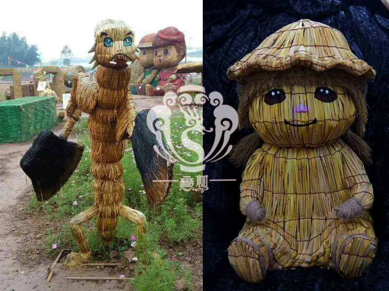 稻草人藝術,不僅充分利用的稻草秸稈制作出各種有趣的形象,與此同時還能減少秸稈的焚燒,為我們的藍天白云,子孫后代做一份貢獻!現在的精致稻草人藝術通常是由專業美術老師的造型放樣,然后由焊工師傅焊接出立體造型造型,然后以稻草或者稻草繩為材料編捆制作而成。