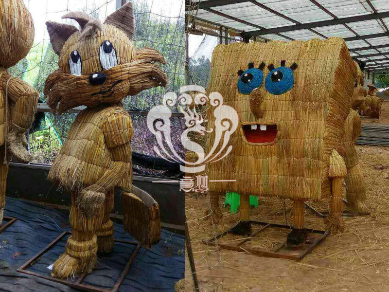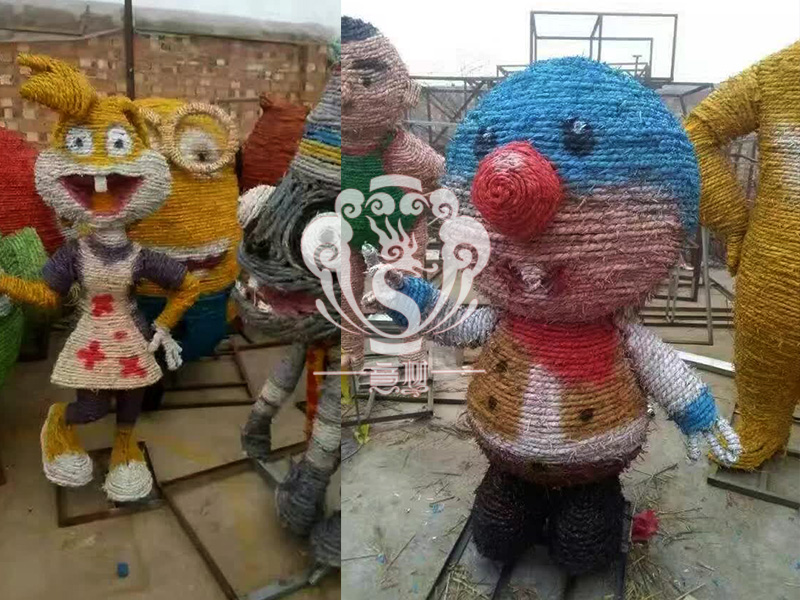 現在的精致稻草人藝術通常是由專業美術老師的造型放樣,然后由焊工師傅焊接出立體造型造型,然后以稻草或者稻草繩為材料編捆制作而成。