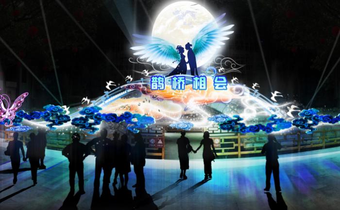 作為情侶而言,牛郎織女相聚的故事耳熟能詳,中國民間傳說陰歷七月初七晚上喜鵲就把自己的羽毛和身體奉獻出來,填河成橋,讓牛郎、織女在橋上相會,七夕日多雨正是他們哭泣的淚水。這組《鵲橋相會》以夢幻的手法,將牛郎織女相會的場景重現,寓意著情人或夫妻久別之后的團聚,祝愿有情人終成眷屬。