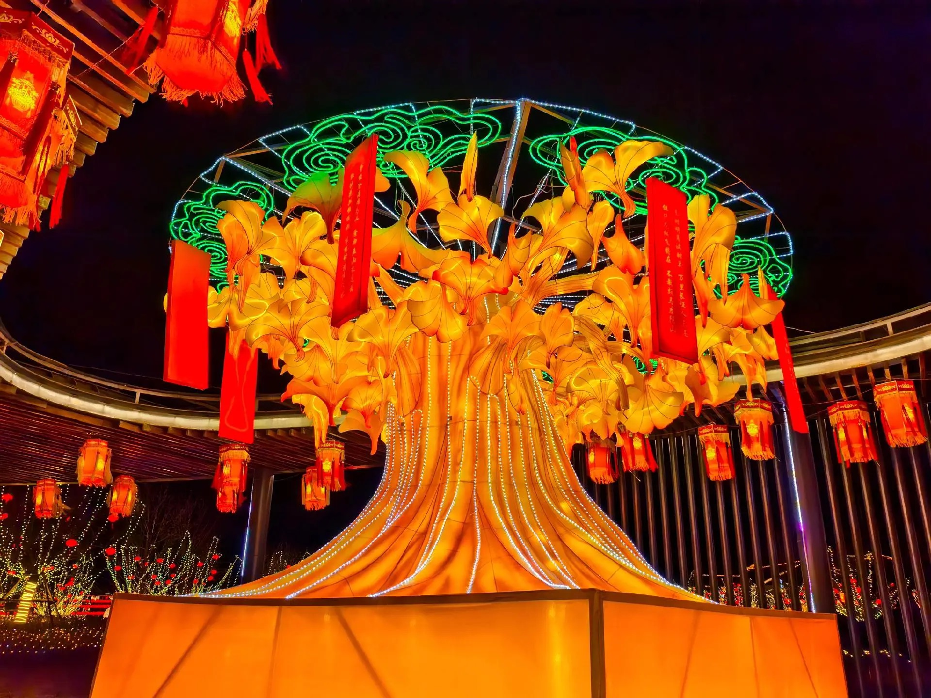 燈展現(xiàn)場(chǎng),千燈萬盞與龍馬湖的山、水、橋景相映成趣,構(gòu)筑成一幅絕美的新春光影畫卷。高達(dá)十二米的“富貴平安”燈組喜慶洋溢,五顏六色的牡丹花團(tuán)錦簇,成為全場(chǎng)焦點(diǎn);